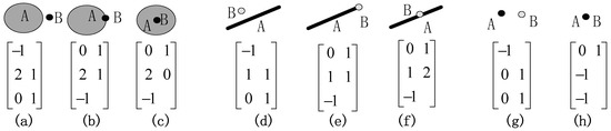 Figure 22. Topological relations between points/regions, points/lines, and points/points, as discriminated by the E-WID model. (a) Region A and point B are disjoint; (b) Point B is on the boundary of region A; (c) Point B is inside of region A; (d) Line A and point B are disjoint; (e) Point B is on the boundary of line A; (f) Point B is inside of line A; (g) Point A and point B are disjoint; (h) Point A is equal to point B.
