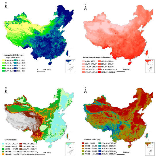 To explore how specific factors of the natural environment affect mammalian distribution in China, we selected 11 variables as environmental factors according to primary explanatory variables among hypotheses. The minimum temperature of the coldest month (MTCM) and maximum temperature of the warmest month (MTWM) reflect the freezing tolerance hypothesis [13,14]. The MTCM and MTWM were obtained from 1 km monthly temperature datasets for China from 2012 to 2014 of the National Earth System Science Data Center, National Science and Technology Infrastructure of China (http://www.geodata.cn). Annual mean temperature (AMT) is a natural factor representing the environmental heat hypothesis [40]. Annual precipitation (AP), normalized difference vegetation index (NDVI), and actual evapotranspiration (AET) reflect the productivity level of the region [41,42]. AMT was obtained from the annual average temperature dataset of China in 2015. AP was obtained from the annual precipitation data set of China in 2015. NDVI was obtained from the spatial distribution dataset of the normalized difference vegetation index of China in 2015. The datasets were obtained from the Data Center for Resources and Environmental Sciences, the Chinese Academy of Sciences (RESDC) (http://www.resdc.cn/DOI). The actual evapotranspiration was derived from the terrestrial evapotranspiration dataset across China in 2015. The dataset was provided by the National Tibetan Plateau Data Center (http://data.tpdc.ac.cn). Elevation (Ele), altitude relief (AR), soil type (ST), geomorphic type (GT), and land-use type (LT) represent habitat heterogeneity [43]. The digital elevation model with a spatial resolution of 30 m was derived from Aster GDEM. Soil type was derived from the distribution data of 1:1 million soil types in China, which consist of 13 soil orders. Geomorphic type data were derived from the spatial distribution dataset of 1:1 million geomorphic types in China, which have 8 categories. Land-use data were obtained from the remote sensing monitoring methods of land-use/cover changes of China in 2015, which have 8 categories. The datasets were provided by the Data Center for Resources and Environmental Sciences, the Chinese Academy of Sciences (RESDC) (http://www.resdc.cn). All maps of environmental factors were clipped and transformed uniform Albers equal-area conic projection and converted to grid squares, as well as joining the corresponding species distribution data. Due to the analysis being done in grids of 10 × 10 km, the information from the original layers was transformed into the resolution of 10 × 10 km. The MTCM, MTWM, AMT, AP, NDVI, AET, and Ele were the average of corresponding variables in each grid cell. Altitude relief (AR) was the height difference between the highest point and the lowest point in each grid. The Geodetector model uses categorical variables rather than numerical. Here, we converted numerical factors to categorial factors according to the algorithm of Natural Breaks [44], which is a classification method to divide similar values into one class and maximize the difference between classes [45]. We classified the values of eight numerical variables into 10 classes (shown in Supplementary Materials Table S1). According to the area-dominant method, the types of categorical variables with the largest coverage area were selected as the types for each grid cell. The spatial distributions of classifications for 11 variables are shown in Figure 2.