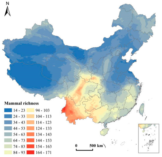 Terrestrial mammals were widely distributed throughout the provinces of China (Figure 3). Noticeable spatial heterogeneity in mammalian distribution was detected in China, with low richness in the east, west, and north, but high richness in the south. Southern China, especially the Hengduan Mountains in Yunnan Province, supported the greatest richness in terrestrial mammalian species. On the contrary, the species richness was low in western and eastern China. Mammalian richness was lowest, with few species, in northern China.
