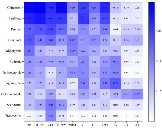 The richness distribution of most orders was mainly affected by MTCM and AP. Chiroptera is mostly concentrated in southern China and low in most regions in the north. The geographical environment factors that mainly influenced the distribution of species richness of Chiroptera (Figure 4) were MTCM, AP, and MTWM. AR minimally affected distribution. The order of Pholidota has few species with a small distribution in China. The environmental factors affecting the richness distribution of Pholidota were similar to those of Chiroptera. The species in Primates are only distributed in southern China. The richness distribution of primates was significantly affected by MTCM and AP. Carnivora have a wide distribution of richness in China. AP and AET were the main factors affecting species richness distribution. Eulipotyphla are spread all over the country, except for the Qinghai–Tibetan Plateau. AP, with the largest q value, had a remarkable effect on the spatial distribution of species richness of Eulipotyphla, followed by NDVI.