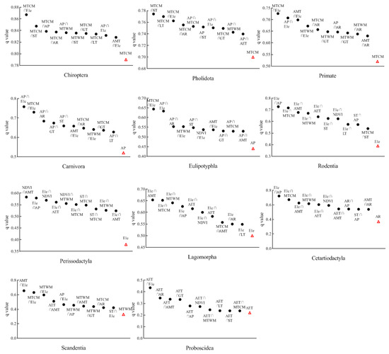 The species richness of Rodentia, Perissodactyla, and Lagomorpha was affected by elevation, soil type, and AMT. Rodentia is widespread all over the country. The species distribution of Rodentia was affected by the elevation and soil type. Perissodactyla is only distributed in western China, strongly influenced by the elevation and ST. The species richness of Lagomorpha is highest in the eastern Qinghai–Tibetan Plateau. Elevation had a marked impact on the distribution of species richness of Lagomorpha. The q value of Ele was 0.50, followed 0.42 for AMT. However, the environmental factors influencing the species richness of Cetartiodactyla, Scandentia, and Proboscidea were different from other orders. Cetartiodactyla species richness in the north is lower than that in the south. Cetartiodactyla with differences in distribution richness was mainly related to AR and GT. The distribution range of Scandentia is too small, with species being significantly affected by AET. Proboscidea is distributed in a small area, not affected by any of the environmental variables except for AET.