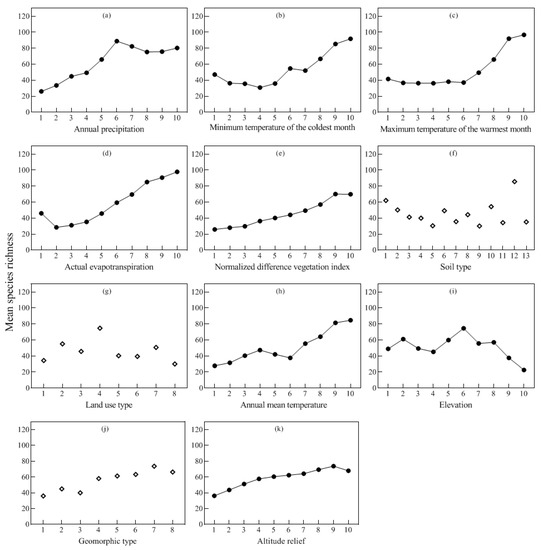 In areas where the annual precipitation was 897.83–1146.46 mm, species richness was the most abundant. However, below the level of 305.96–480.55 mm of the AP, less precipitation was not conducive to the aggregation of many species. For the terrestrial mammal richness, most of the species richness was in the AMT range of 20.28–28.23 °C (Figure 6). However, when the annual mean temperature was below zero, the species richness was low. The species richness was most abundant in the range 13.28–23.65 °C of MTWM and the range 6.39–17.64 °C of MTCM. Extremely low ambient temperatures had negative impacts on the distribution of animals. In areas where the actual evapotranspiration was large, the species richness was high. A higher vegetation index denoted a higher species richness. Mammalian species richness was the most abundant in forest land, with some mammals mainly distributed in shrub wood. However, the species richness was low on unused land, including bare areas, where land is difficult to be used. Terrestrial mammals were mainly distributed in areas with ferralsols. These soils were mainly distributed in humid tropical and subtropical regions. At the elevation range of 1905.60–2562.62 m, species richness was greatest but then decreased with increasing altitude. Species richness was abundant at 2613–3816 m of altitude relief, but richness declined when altitude relief was too flat. There was a high level of species richness in the extremely undulating mountains, and there were significant differences among the landform types.