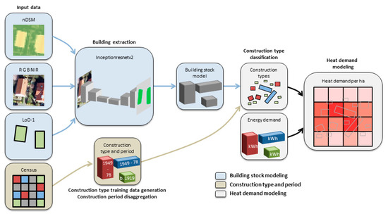 Considering these latest developments in deep learning-based image analysis, in this paper, we will explore the capabilities of applying current deep neural networks on remote sensing data for the generation of a building stock model and analyze its applicability for urban building energy modeling at a city scale. Specifically, we apply a U-net Inceptionresnet on high resolution aerial imagery and DSM to generate a 3D building model incorporating the building geometry (footprint area and floor area) at a city scale. In a next step, we perform semantic labeling of the building construction type (semi-detached/detached houses, terraced houses, and multi-family houses) based on morphometric parameters such as the area, shape, compactness, and height etc. using a shallow machine learning approach [37,38,39,40,41]. For use type and building age, we integrate ancillary geo-data at the urban block and census data. In a final step, we perform bottom-up building energy demand modeling for each building at a city scale based on characteristic energy demand data for German buildings [42,43]. The validity of the proposed approach using remotely sensed data is evaluated with officially modeled values from the Energy Atlas (https://www.energieatlas.nrw.de).
