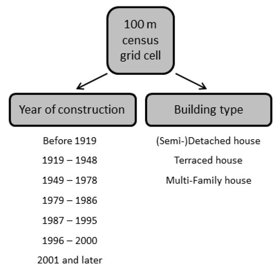 For data on buildings, we incorporated data from the German Census data base where, among socio-demographic parameters, data on the building age and construction type are also stored at the neighborhood level in 100 × 100 m grid cells (Figure 2). Finally, we used data from the Energy Atlas of NRW as a source for validation of the energy modeling.