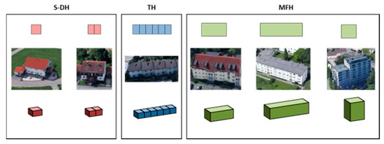 The 3D buildings generated from the preceding building extraction step were classified as one of three main construction types related to the energy demand: (a) (Semi-)detached houses (S-DH); (b) terraced houses (TH); and c) multi-family houses (MFH) (Figure 4). Classification was performed by a supervised Random Forest (RF) approach based on morphometric building features and census data [55]. Random Forest is a widely applied ensemble classifier with only very little user input and parameter tuning, which makes it very simple and straightforward to apply, and it generally yields very good accuracies [56]. For each building, 24 morphometric parameters, including simple parameters such as the area and perimeter or more complex features, were calculated. A detailed description of the morphometric features and the workflow is presented in Table 2 and in [38,57], and in [58], respectively.
