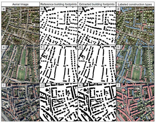 Results of the building extraction using U-net Inceptionresnetv2 for various building morphologies in the city of Münster. Aerial images as input data are depicted in (a,e,i), reference building footprints from the official LoD-1 building model are shown in (b,f,j), results of building footprint extraction are presented in (c,g,k), and the result of labeled construction types is displayed in (d,h,l).