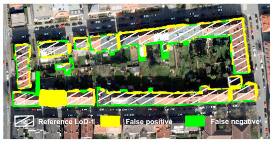 Additionally, a detailed assessment of false positives and false negatives at the pixel level revealed that some of the reported errors in the accuracy assessment are not related to the performance of the applied U-net Inceptionresnetv2 for building extraction, but to geometric imprecision between the reference LoD-1 building footprints and the digital orthophoto (Figure 6). Since the orthophotos are not referenced to a perfect nadir, buildings are not only represented by their roofs (footprints), but also some parts of the façades that are visible, whereas reference buildings are only represented by their footprints. Therefore, for each building, a few pixels are detected as false positives and a few pixels are detected as false negatives, thus impacting the agreement between extracted buildings and reference buildings. Furthermore, small secondary buildings, e.g., in backyards or garages, are prone to false negatives because of their small areas and low heights. Figure 6 shows an example of an extracted building which is not part of the reference data but is present in the aerial image. In general, however, only very few false positives and false negatives are related to temporal inconsistencies between the data sets (Table 1) because relatively, only a few buildings are newly constructed or demolished in the time span of two years.