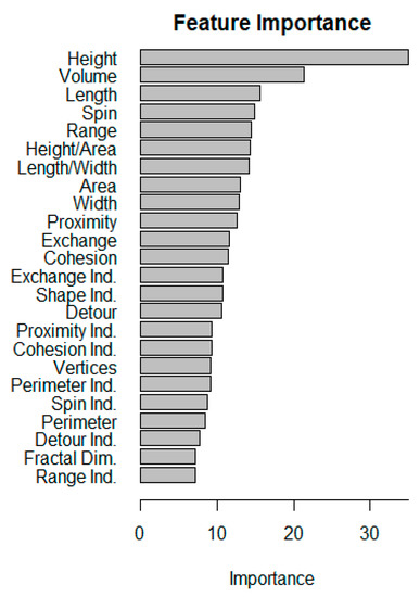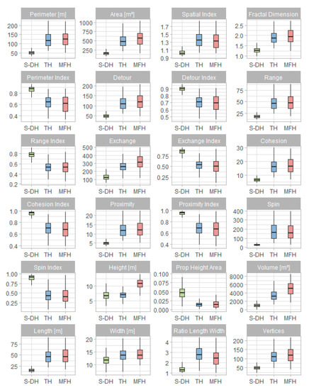 These quantitative performance evaluations are also supported by the graphical representation of the value range for all morphometric parameters presented as boxplots in Figure 7. For most of the parameters, the values of the construction type S-DH are significantly distinguishable from those of TH and MFH. The feature value ranges for TH and MFH are more similar; however, the building height serves as a reliable separator of these two classes. A detailed view on the importance of each morphometric parameter (Figure 8) underlines this observation, with height and volume being very relevant for the semantic labeling of construction types.
