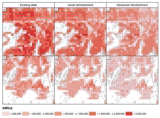 The heat demand was modeled for each individual building based on tables with characteristic energy demands from Table 3 and Equation (2). The tables include characteristic heat demands for three refurbishment scenarios of existing state, usual refurbishment, and advanced refurbishment. To analyze the potential of targeted energy savings per, e.g., construction type or construction period, we used all three scenarios for retrofit analyses at a city scale. In this way, the heat demand was obtained in kWh/a for each individual building and then aggregated to 100 × 100 m grid cells (Figure 9). The figure depicts in a,b,c the area in and around the city center with large, old buildings in the existing state, without any thermal renovations. Therefore, very high heat demands are reported for this area. These are also comparatively high with usual and advanced refurbishment. The other example in d,e,f focuses on (semi-)detached houses in sub-urban developments with a significantly lower heat demand for all three refurbishment states.