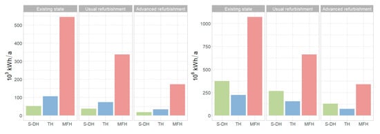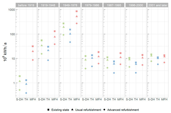 With regards to the construction period, the savings in energy demand were highest for buildings constructed in the 1950–1970s: A total of 1268 × 106 kWh/a was related to this construction period in the existing state scenario; 814 × 106 kWh/a in the usual refurbishment; and 407 × 106 kWh/a in the advanced refurbishment scenario.