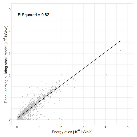 The assessment of the validity of results for urban building energy modeling is considered a challenging task because real world data on the energy demand are often not accessible due to data privacy. Furthermore, there exist a great variety of different approaches for energy modeling, which means that interpretations of comparisons of two modeled data sets must be considered with caution. As a proof of concept, however, we compared the results of the heat demand modeling with the modeled heat demand for the city of Münster from the Energy Atlas of the Federal State North-Rhine Westphalia (www.energieatlas.nrw.de). The direct comparison of modeled heat demands at the 100 × 100 m grid cell level is depicted in Figure 12. The total derived heat demand from the Energy Atlas is reported to be 1268 × 106 kWh/a and for the deep learning-based building stock model, it is 1080 × 106 kWh/a, which is only about 15% lower. Furthermore, the R2 of 0.82 indicates a good agreement between the two data sets, for both very high and very low heat demands. The small number of grid cells for which our approach reports values close to zero can be mostly related to the modifiable areal unit problem (MAUP) because of the varying input geometries for the building stock model which are intersected by the borders of the 100 × 100 m grid cells. Moreover, they can be related to different spatial domains for the use type: While the Energy Atlas incorporates a differentiation of residential and non-residential buildings at the individual building level, we used land-use at the block level. Other differences in the methodologies relate to the characteristic heat demands used: In our model, we used the latest published heat demand for construction types and construction periods from the year 2011 (https://www.iwu.de/fileadmin/publikationen/gebaeudebestand/episcope/2015_IWU_LogaEtAl_Deutsche-Wohngeb%C3%A4udetypologie.pdf page 113-115). While the Energy Atlas used data from 2003 (https://www.iwu.de/fileadmin/publikationen/gebaeudebestand/2003_IWU_BornEtAl_Energieeinsparung-f%C3%BCr-31-Musterh%C3%A4user-der-Geb%C3%A4udetypologie.pdf page 7). Despite these variations between input data and methods, the good overall agreement between the two data sets is considered a proof of concept for the proposed approach using deep learning-based building stock models from orthophotos.
