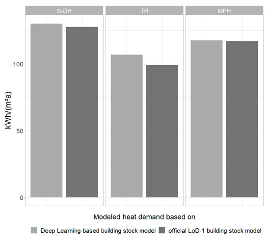 To account for the impact of the data source of the building stock model for heat demand modeling, Figure 13 depicts the modeled heat demand based on the deep learning-based building stock model and the official LoD-1 building model using the same method and characteristic heat demand for all three construction types. The comparison of both building stock data sets reports very small variations of +2.3% for S-DH, +6.6% for TH, and +0.4% for MFH, respectively.