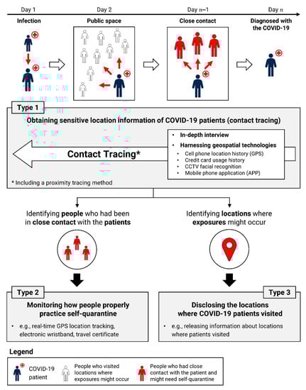 Among various COVID-19 mitigation methods, those that capture geographers’ attention are methods that harness people’s location data, which are private and often sensitive [4,5]. For example, some countries have obtained the location information of COVID-19 patients from their mobile phones (e.g., GPS trajectories records) to accurately find the close contacts of these patients (a practice called contact tracing). People’s private location information has played an important role when implementing COVID-19 control measures [6,7,8,9,10] (Figure 1).