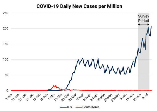 The data used for this research were collected via Qualtrics. Solicitations were distributed via the Facebook advertisement service. By using this service, one can advertise a solicitation Facebook post to target users (e.g., South Korean participants: adults 18+ years old living in South Korea; U.S. participants: adults 18+ years old living in the U.S.). In addition, solicitations were also distributed via the authors’ Twitter accounts. We furthermore used a snowball sampling method to recruit more survey participants. Survey participants were recruited between 25 June 25 and 10 July 2020. Since the COVID-19 situation is changing rapidly, it is worth mentioning that the COVID-19 pandemic situations in South Korea and the U.S. were significantly different during the survey period (Figure 2); South Korea experienced relatively low daily new cases (compared to the peak in early March), while the U.S. experienced a second surge (Wave 2) in new cases starting from mid-June after several states re-opened.