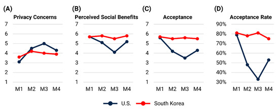 (A) Average privacy concerns; (B) Average perceived social benefits; (C) Average acceptance; (D) Acceptance rate (M1–4).