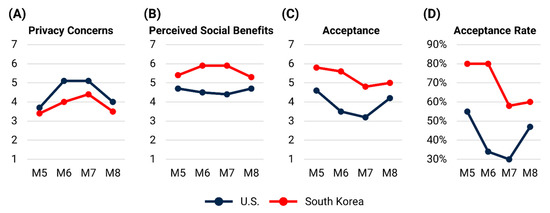 (A) Average privacy concerns; (B) Average perceived social benefits; (C) Average acceptance (D); Acceptance rate (M5–8).