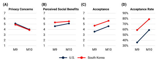 Second, South Koreans have lower privacy concerns and higher perceptions of social benefits, compared to people in the U.S. One possible explanation for this is that people in South Korea have less concern about their privacy culturally. Specifically, because of the ongoing national security threat associated with the military conflicts with North Korea since the Korean War in the 1950s, South Koreans are familiar with pervasive technology-based surveillance systems, such as CCTV (closed-circuit television) and facial recognition technology, which are generally considered to be helpful for promoting national security. Moreover, since South Koreans have already experienced various COVID-19 mitigation measures [13,33] and witnessed the effectiveness of these measures in successfully controlling the COVID-19 pandemic, they may perceive considerable social benefits for these measures.