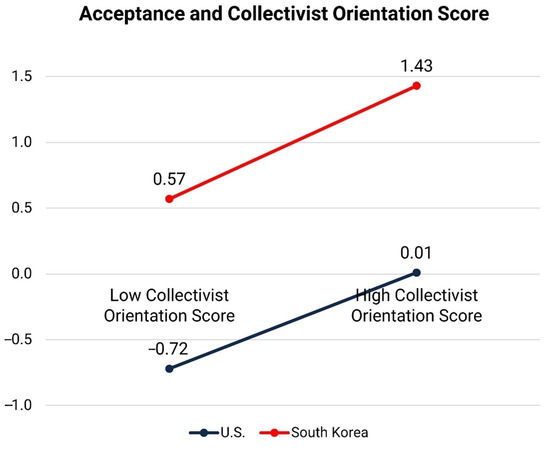 To better understand the role of the residing country (U.S. and South Korea) and an individual’s collectivist orientation, we investigated average acceptance in terms of the residing country and the collectivist orientation level (Figure 7). First, in both countries, people with high collectivist orientation scores (i.e., z-score ≥ 1.0) have higher acceptance of COVID-19 control measures than those with low collectivist orientation scores (i.e., z-score ≤ −10). Second, when the collectivist orientation score is the same, the average acceptance of COVID-19 control measures of the participants in South Korea is higher than that of the U.S. participants. Lastly, people’s average acceptance of COVID-19 control measures in the U.S. who have high collectivist orientation scores is lower than that of people in South Korea who have low collectivist orientation scores. This indicates that the role of country can be more important than that of collectivist orientation in explaining people’s acceptance of COVID-19 mitigation measures.