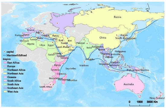 There are two major routes of the Maritime Silk Road that form our study area: (i) from the Chinese coastal ports across the South China Sea, via the Malacca Strait and the Indian Ocean to reach Europe, and (ii) from the Chinese coastal ports to the South Pacific Ocean. The study area consist of 64 countries, including northeast Asia, southeast Asia, Oceania, south Asia, west Asia, northeast Africa, east Africa, south Africa, and Europe, as shown in Figure 1.