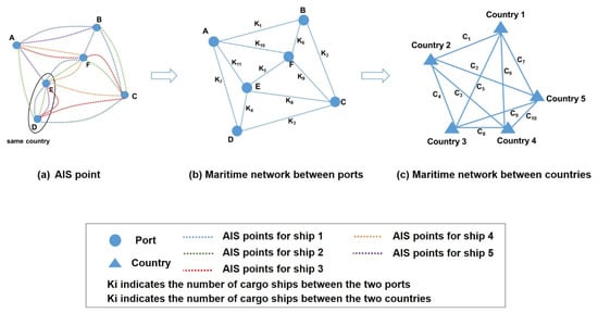 Construction of maritime network using AIS data: (a) Positioning different ships routes by real-time longitude and latitude information; (b) Identifying the ports in routes, and building a maritime network with ports as nodes; (c) Combining WPI and national basic information data to build a maritime network with countries as nodes. Source: Adapted from Yu et al. [35].