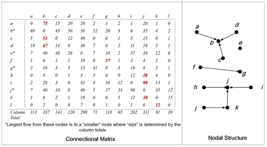 Network structure in primary linkage analysis (PLA). The red of the number represents the largest flow of a “smaller” node. Source: Adapted from Nystuen et al. [49].
