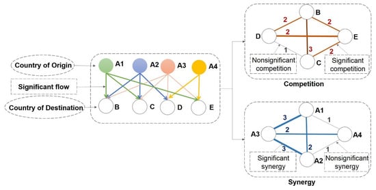The significant flows derived from the multiple linkage analysis method can reflect not only the importance of countries but also the interrelations of the countries [50]. Regardless of the condition of the formation of traffic relations between countries, the distribution of significant traffic flows in the network determines the quantitative judgment on whether there is a relation between competition and synergy to then analyze the current situation of traffic. As shown in Figure 4, in the maritime traffic network, if there are significant flows from more than one country to a target country, the target country plays a more important role in the traffic flow links of these outflow countries, and if multiple target countries receive significant flows from the same country, then these target countries will form competitive relations. For example, if the significant flow of A1 flows to B and C, then B and C will form a competitive relationship. If there is an intersection between the target countries pointed to by a significant flow of two countries, the two countries will form a synergy relationship. For example, when the significant flow of A1 flows to B, C, E, the significant flow of A2 flows to B, C, D, and the target country has an intersection {B, C}, then A1 and A2 have a synergy relationship. Both the “competition” and “synergy” networks between countries are undirected weighted networks. The relationship between competition and synergy has no direction and the two ends are equal, and the degree is divided into strong and weak. The intensity of competition is the number of significant flows received by two target countries from the same country of origin. If two target countries undertake significant flows of the same number of original countries, the competition between the two countries is more intense. The intensity of synergy between the two countries is the intersection of the outflow target countries; the greater the intersection, the greater the synergy intensity. To highlight the main traffic relations between countries, they are classified as follows: (i) a relation with intensity equal to 1 is defined as a “non-significant relation.” (In the figure, D and C form a non-significant competitive relation, A2 and A4 have a non-significant synergistic relation); and (ii) a relation with intensity greater than 1 is defined as a “significant relation”. In a significant relation, a relation with intensity equal to 2 is defined as a “weak relation”, and a relation with intensity greater than 2 is defined as a “strong relation” (In the figure, B and C form a strong competitive relation; A1 and A3 form a strong synergistic relation; A2 and A3 also form a strong synergistic relation).