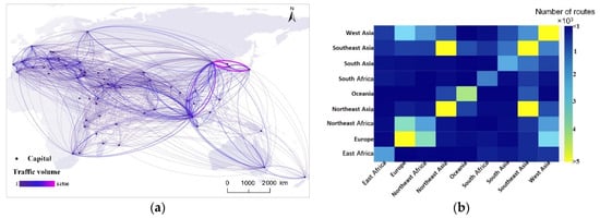 According to the AIS trajectory data, the Maritime Silk Road’s shipping topology network is constructed using the traffic volume from the departure country to the target country as the edge weight (shown in Figure 5a). Meanwhile, the traffic volume between different regions is quantified, and the results are shown in Figure 5b. Additionally, Table 2 shows the ratio of the top 20% of the traffic volume to the total traffic volume in the region.
