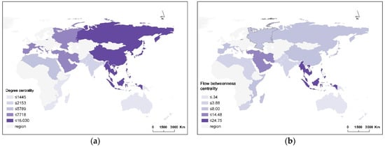 Centrality analysis: (a) Regional maritime connection capacity; (b) Regional maritime transshipment capacity. The value is calculated with UCINET 6.