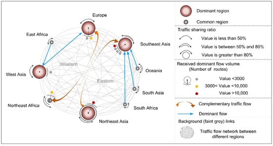On the basis of centrality analysis, and with the help of primary linkage analysis, the status and relations of each region are further studied (shown in Figure 7). It can be seen that the Maritime Silk Road primary traffic flow forms two groups: a western group centered around Europe and an eastern group centered southeast Asia. These groups are relatively independent and show distance proximity characteristics indicating that countries tend to trade closely with their neighboring countries. Among the eastern groups, Southeast Asia is the region that bears the most dominant flow; Northeast Asia, South Asia, South Africa, and Oceania have the largest traffic flow to southeast Asia. The two-way traffic volume between Northeast Asia and Southeast Asia is over 10,000 vessels. At the same time, the regional traffic sharing ratio within this group is relatively high, with 86.4%, 69.4%, 55.4%, 53.7%, and 48.5% in Northeast Asia, Southeast Asia, Oceania, South Asia, and South Africa, respectively. This shows that half of the traffic in these regions often flows to another region. Therefore, Oceania, South Asia, and South Africa are highly dependent on Southeast Asia, while Northeast Asia and Southeast Asia have formed strong marine traffic relations. In the western group, Europe has the most dominant flow; Northeast Africa and West Asia have large dominant flows into Europe. The traffic volume between Northeast Africa and Europe, both of which are located on the coast of the Mediterranean Sea, is approximately 3500 vessels; therefore, the traffic is relatively convenient. The sharing ratio of regional traffic in this group is relatively low, with 34.3%, 35.5%, 49.6%, and 59.6% in East Africa, West Asia, Europe, and Northeast Africa, respectively. It can be seen that the distribution of regional maritime traffic flow in the western group is more balanced than that in the eastern group, and the maritime connection will be more stable. From the above centrality analysis, we can see that West Asia, with its geographical advantages, has an extensive and stable traffic contact and that its transshipment capacity is also prominent. It has a gateway identity, and its position in the western group cannot be ignored.