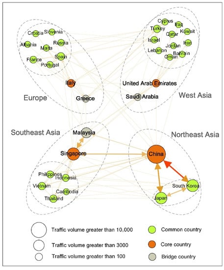 Nine countries in southeast Asia, 4 countries in northeast Asia, 15 countries in West Asia, and 11 countries in Europe are considered. The backbone of the Maritime Silk Road network is obtained using the multiple linkage analysis method, and then its role is analyzed along the Maritime Silk Road, as shown in Figure 8. The traffic flow out of West Asia is the most significant, and Europe has received the most significant traffic inflow.