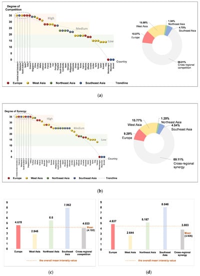 From the perspective of the spatial distribution and intensity of traffic relations (Figure 9), interregional traffic relations are far more than intraregional traffic relations. Interregional competitive relations account for 68.01%, and interregional synergistic relations account for 69.11%, but the intensity of the relations is similar to the overall mean intensity value, indicating that there are more competition and synergy relations among interregional countries. Within each region, West Asia has the most traffic relations, with competition and synergy relations accounting for 15.88% and 15.77%, respectively, but their intensity is far below the overall mean, indicating that there are more competition and synergy relations among the West Asian countries, but the intensity is very small. The proportions of competition and synergy in Europe are 10.07% and 9.29%, respectively, and their intensity exceeds the overall mean intensity value; the relations between countries are relatively strong. The proportions of competition and synergy among the Southeast Asian countries are 4.70% and 4.54%, respectively; the intensity of their relations far exceeds the overall mean intensity value, and interaction between the countries is extremely strong. The two types of traffic relations in Northeast Asian countries account for less than 2%, but their relations are stronger (second only to Southeast Asia). Therefore, countries in the dominant region have established extensive and robust transregional ocean-going traffic relations, but the intensity of these relations is not very strong. Countries should actively strengthen interregional maritime trade cooperation and build a broader platform for their own development.