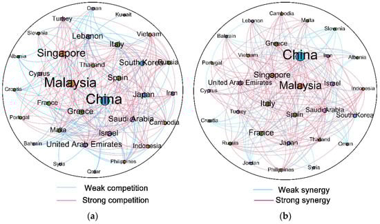 Based on the competition-synergy model, a Maritime Silk Road dominant regional maritime traffic competition and synergy relations network is constructed, and quantitative analysis is carried out based on the number and intensity of the relations, as shown in Figure 9. The distribution of the degree of traffic relations in various countries is shown in Figure 9a,b. The trend lines of the two relations are similar, and the degree value of most countries is above 10. We define countries with degrees between 30 and 35 as high-level countries, between 20 and 30 as middle-level countries, between 10 and 20 as low-level countries. It can be seen that, except for Malaysia, Singapore, and China, the high-level countries are all west Asian or European–Mediterranean countries; the East Asian countries account for half of the middle-level countries; except for Korea, the low-level countries are West Asian or European–Mediterranean countries. It can be seen that the countries in west Asia and the Mediterranean region are polarized. In contrast, the traffic relations of east Asian countries are more balanced. In addition, Malaysia, Saudi Arabia, Spain, Greece, Italy, and the UAE have the most competitive relations; France, Malaysia, Saudi Arabia, Spain, Singapore, Italy, and the UAE have the most synergistic relations.