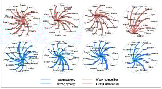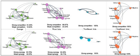The significant traffic network within each region is shown in Figure 12. It can be seen that the strong relations in Europe are four times as large as the weak relations. Italy, Greece, Spain, France, and Malta have formed the strongest traffic relations network in the European–Mediterranean region. Among them, the competition–synergy relations between Italy and Greece are the strongest, and the competition between Italy and Spain is stronger than others. Slovenia and Albania, which have relatively small traffic volumes, primarily form weak relations with the other eight countries. Although the traffic volume of Malta is also small, it undertakes strong relations, that may be due to the fact that Malta is located at the center of the Mediterranean Sea and adjacent to Italy, a major maritime country. The strong relations in West Asia are twice as large as the weak relations. Six countries, including the UAE, Saudi Arabia, Turkey, Israel, Cyprus, and Lebanon, have formed the strongest traffic network in West Asia. Saudi Arabia and the UAE have the strongest competition–synergy relations, Turkey and Israel have stronger competition with each other, and Turkey and Saudi Arabia have the strongest synergy relations. The significant traffic relations in east Asia are all strong. Northeast Asia, China, South Korea, and Japan have comparable competition intensity, but the synergy between China and South Korea is more dominant. In southeast Asia, Singapore and Malaysia have formed the strongest competition–synergy relations within the region, Malaysia and Thailand have stronger competition with each other, and Singapore and Thailand have stronger synergies. Overall, the significant traffic network among the countries in dominant regions of the Maritime Silk Road is dominated by strong traffic relations. The geographically adjacent maritime countries are more likely to form the strongest combination of regional competition–synergy.
