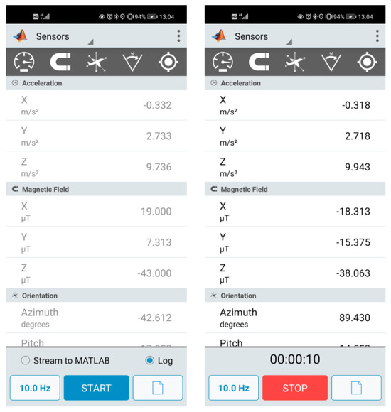 Unfortunately, the acceleration will have an error after the calibration, which is called “deviation”. This “deviation” needs to be estimated and eliminated to obtain accurate information. The acceleration data in the x and y directions should be 0, and the acceleration data in the z direction should be 1 g (9.8 m/s) when the smartphone is stationary on a plane. Furthermore, any other readings are deviations. So, the corrected acceleration value is as Equation (2):