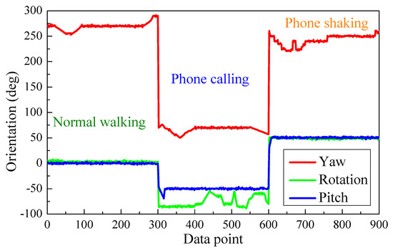 The users’ activity patterns must be correctly distinguished in order to increase the localization accuracy, because different users’ activity patterns will produce different experimental results. The user activity patterns are divided into three categories: “normal walking”, “phone calling” and “phone shaking” [21]. The three activity patterns are distinguished by obtaining acceleration data and orientation data of the smartphone from the accelerator sensor and gyroscope sensor. The process of the data acquisition is shown in Figure 3. The changes of the accelerator sensor data for three user activity patterns in x, y, and z directions are shown in Figure 4. It can be seen that the accelerator sensor data are greatly different along the x, y and z directions in different users’ activity patterns. The user’s smartphone states (orientation: yaw, pitch, rotation) show a significant difference in different users’ activity patterns as shown in Figure 5. Therefore, a machine learning-based classification algorithm is used to process the user’s smartphone states and acceleration data characteristics are used to distinguish users’ activity patterns with the assist of magnetometers and gyroscopes.