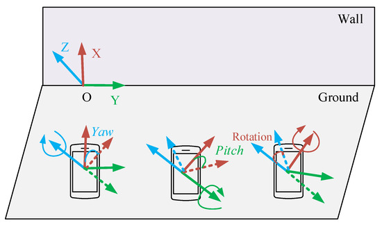 where , and are the corresponding matrices of rotation, pitch and yaw. Furthermore, as shown in Figure 6, the rotation, pitch, and yaw indicate the rotation of the smartphone around the x, y, and z axes, respectively.