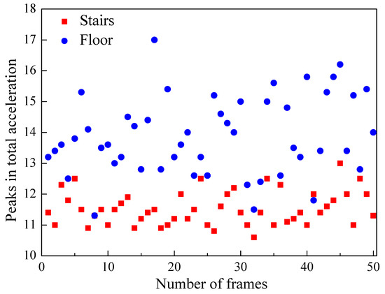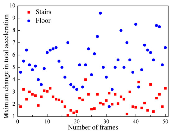 The above characteristics are the output based on the Recursive Feature Elimination (RFE) method. RFE is a well-known method for performing the important task of characteristic selection. It fits the model and removes the weakest characteristics and sorts the characteristics by recursively eliminating in each iteration. Furthermore, find the best number of characteristics by using cross-validation of RFE. The selected characteristics represent different values of the state of the user walking on the stair or the floor. For example, Figure 7 shows the characteristics of when the user is walking on a floor and stair, respectively. Similarly, Figure 8 shows the characteristics of for two user activities, respectively (each value in Figure 7 and Figure 8 is calculated by 1 frame (1 s) of data collected at 10 Hz). It can be seen that the above characteristics are quite different in two different cases. The calculated characteristics , , , , and are fed into the training models of machine learning algorithm: K-NN, DT and SVM. Then the training model utilizes the data collected by the user to detect inter-floor. We increase the link of inter-floor detecting to increase the localization accuracy, because we do not keep tracking the user all the time during the floor locating, just mapping and matching the data sent by the user’s smartphone and determining the user’s current floor according to the principle of the majority, which may cause some errors due to special circumstances such as the user going up and down the stairs.