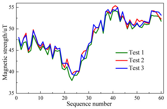 In addition, as shown in Figure 9 and Figure 10, the geomagnetism along the same path of the indoor floor is similar, and the geomagnetism of different paths along the indoor floor are quite different. Therefore, the magnetic fingerprint database is more convenient and simple in terms of maintenance and update than the barometer database and Wi-Fi database, and the accuracy of data collection is more reliable.