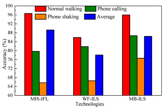 In addition, we can find that the performance of MIS-IFL is seriously affected when the user is in the pattern of “phone shaking”. The main reason is that the smartphone moves continuously in the front and rear direction, which affects the data and introduces noise. However, during the patterns of “normal walking” and “phone calling”, the collected data are smooth, stable and exhibit good performance because the orientation angle of the smartphone changes but remains in a similar location with very little movement around the axis.