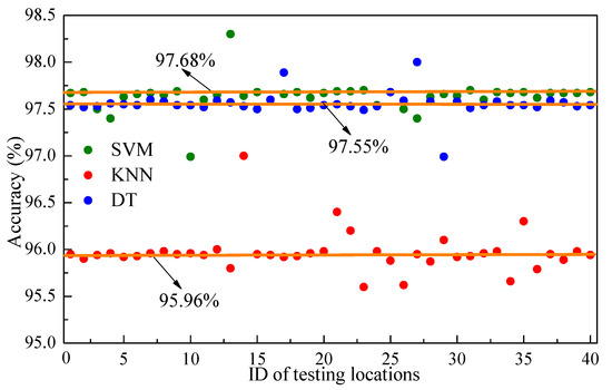 The user is not tracked during the process of IFL, and the user’s previous floor is not known when acquiring the data and performing floor localization. The whole process does not include inter-floor detection. Therefore, the link of inter-floor detection is added to improve the floor localization accuracy. The result of inter-floor detection by a machine learning-based classifier is shown in Figure 14. The three classifiers perform very well when utilizing the characteristics of the accelerator data and magnetometer data to detect up and down stairs. Furthermore, the performance of SVM is superior than K-NN and DT. Therefore, SVM is used in MIS-IFL for inter-floor detection.