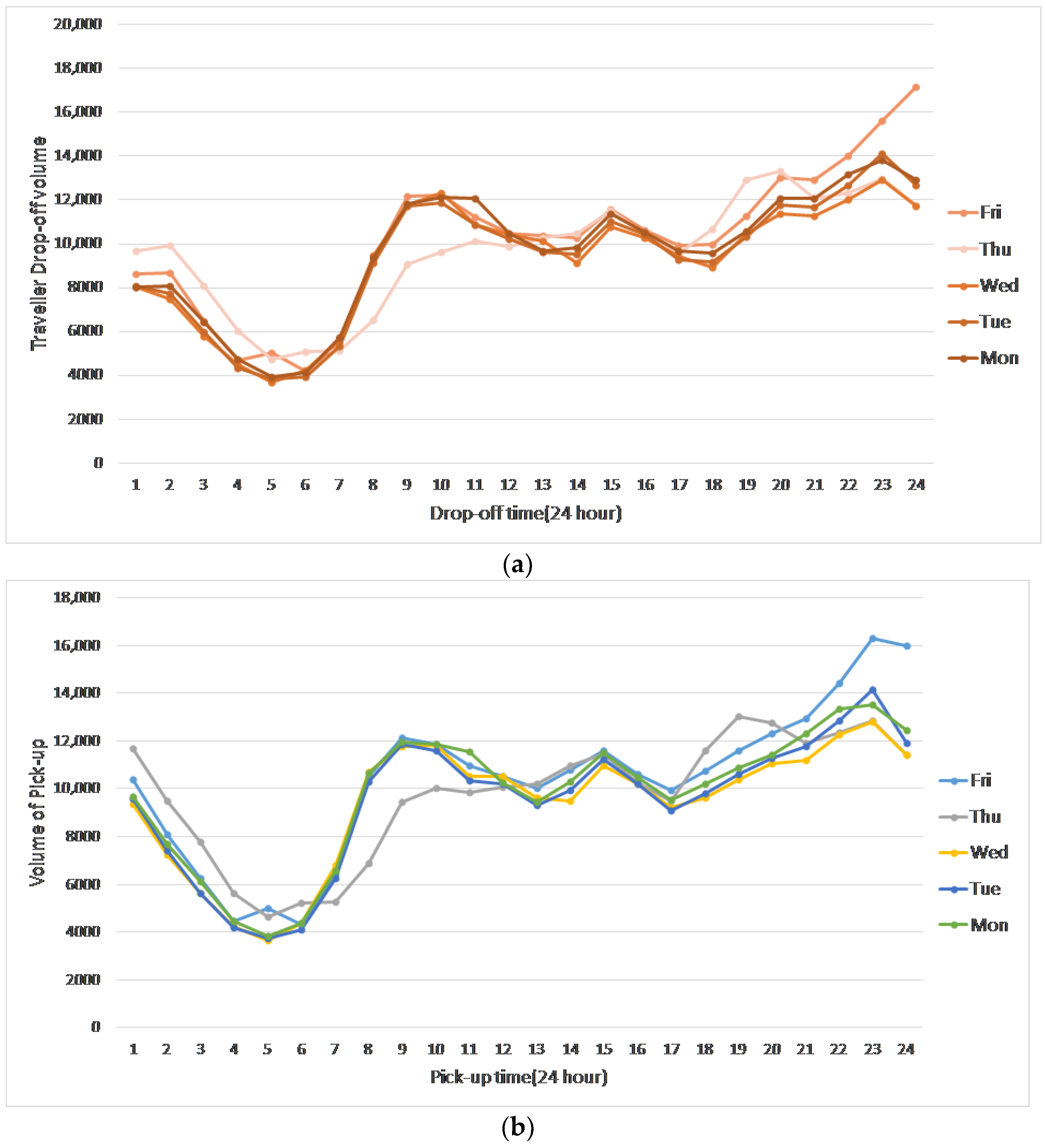 - Yang, Z.; Franz, M.L.; Zhu, S.; Mahmoudi, J.; Nasri, A.; Zhang, L. Analysis of Washington, DC taxi demand using GPS and land-use data. J. Transp. Geogr. 2018, 66, 35–44. [Google Scholar] [CrossRef]