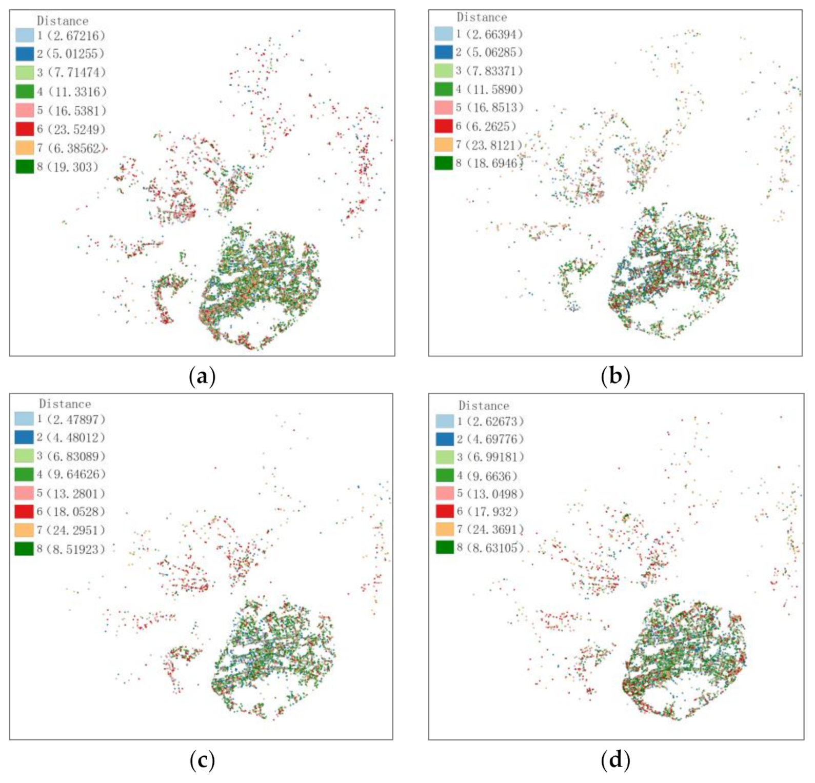 - Zhao, P.X.; Qin, K.; Zhou, Q.; Liu, C.K.; Chen, Y.X. Detecting hotspots from taxi trajectory data using spatial cluster analysis. In Proceedings of the ISPRS Annals of the Photogrammetry, Remote Sensing and Spatial Information Sciences, Fairfax, VA, USA, 13–15 July 2015; Volume 2, pp. 131–135. [Google Scholar]