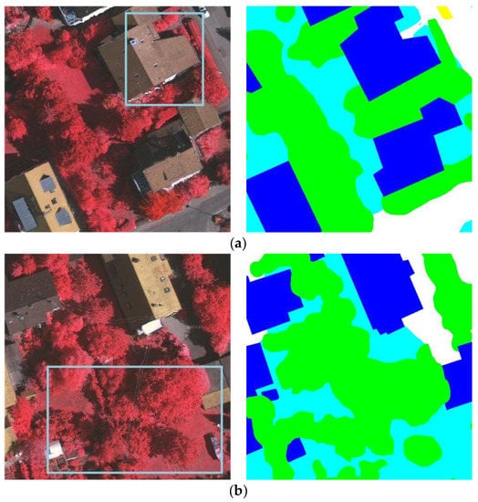 Examples of rich spatial information and complicated senses in high resolution remote sensing image: (a) objects (such as buildings) have rich edge information and details and (b) low vegetation and trees are similar in 2D appearance, but belong to two different labels.