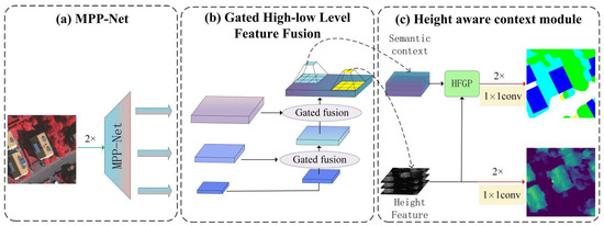 The pipeline of our network, the HSR remote sensing image, first sends two consecutive downsampling stems to extract feature maps and reduce its resolution, and feeds them into a MPP-Net to obtain multi-scale semantic feature maps , and . Adjacent high–low level feature maps adaptively select useful information from themselves via a gate mechanism to gradually perform feature fusion. Then, the fused lowest-level feature map, learns the separate semantic context and height feature, respectively, by two different 3 × 3 convolutions. Finally, the learned height features are used to improve the quality of semantic context by the height feature guide propagation (HFGP) module to realize height aware semantic context. 2× means two consecutive downsampling or upsampling operations.