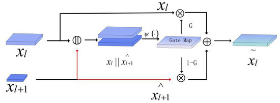 where SE is a squeeze-and-excitation block [44] implementing channel attention and denotes the sigmoid operation. Intuitively, G can be seen as a selective map, which decides the fusing weight between high-level features and low-level features. Then, the gated fusion of adjacent high–low level based on pixel-wise addition can be calculated as shown in: