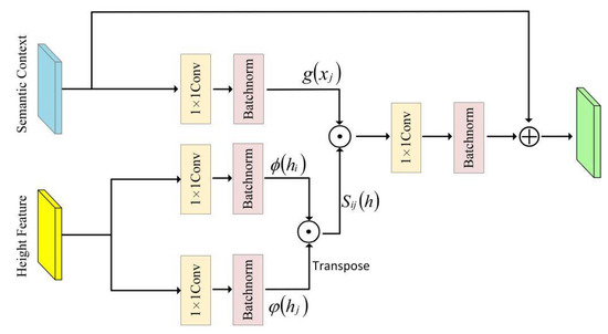 where and are the location of pixel; T is the operation of matrix transpose, and respectively, and are just implemented by a 1 × 1 convolutional layer followed by batch normalization. Then, the produced height similarity is used as an affinity guide to fuse height features and semantic context by another dot-product. Finally, the original semantic context is added to the obtained result to avoid interruption during the whole propagation. Note that the whole propagation process maintains the size and dimension of the semantic features. The height aware semantic context propagation output at location can be calculated as: