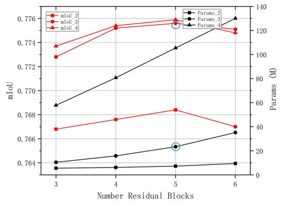 The experimental results are shown in Figure 6. On one hand, as the number of residual blocks increased, the mIoU score reached the highest when the number was 5 and then decreased. This may be due to the fact that the generalization ability of the network decreased with the increase in depth and parameters and the network params maintained linear growth. On the other hand, when the number of paths increased, the mIoU score also increased, while the params of the network increased exponentially. We note that when there were three paths, the mIoU score was slightly less than the highest score of four, but the cost params were much lower than the latter.