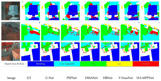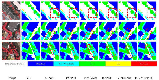 We also selected some samples from the experimental results to show the comparison of the semantic results of our model with other methods on the Vaihingen dataset in Figure 7. It is clear that our method achieved more satisfactory results than the other methods. For objects (such as buildings) with richer details and edges, our method could well preserve this information during the segmentation process. In particular, we used a red dashed box to mark challenging areas that are easy to misclassify. It can be seen from the marked areas in Figure 7 that our method was superior to other methods in distinguishing between trees and low vegetation. This is because our height aware context module uses height features to improve the distinction between objects with a 2D appearance, but different geometric characteristics.