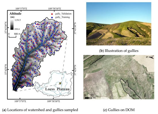 Gully erosion refers to the erosion process that occurs with concentrated runoff [1], which is the most severe type of water erosion and a significant land degradation process [2,3]. Gully occurrence is controlled by a wide range of factors, including topographic parameters (e.g., contributing drainage area, slope gradient), land use, soil types, et al. [1,4], and is associated with the velocity and volume of the surface runoff [5]. Understanding the spatial distribution of gullies is essential for watershed management, soil and water conservation measurements, and infrastructure planning. Gully erosion susceptibility mapping (GESM) is of great interest to researchers as it is beneficial for predicting the spatial probability of gully occurrence [6].