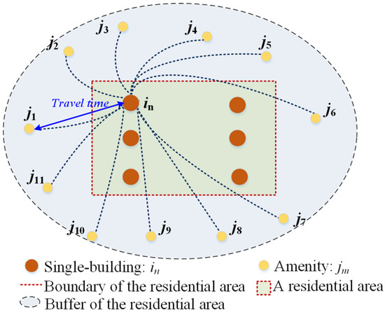 To improve living quality, most people tend to rent or buy real estate located within convenient access to work, schools, parks, or other amenities. There are two elements for measuring housing accessibility, transport cost, and opportunity. Transport cost is characterized by the travel time of the shortest path using the existing transport models from an origin in (single building) to a destination jm (attraction) (Figure 1). Opportunity is used to express absolute values such as the number of residents, capacity, and attractiveness of surrounding amenities. Accessibility of housing estate with a combination of these two elements is used to quantitatively describe the possibility of reaching desired goods, services, activities, and destinations from residential locations [3].